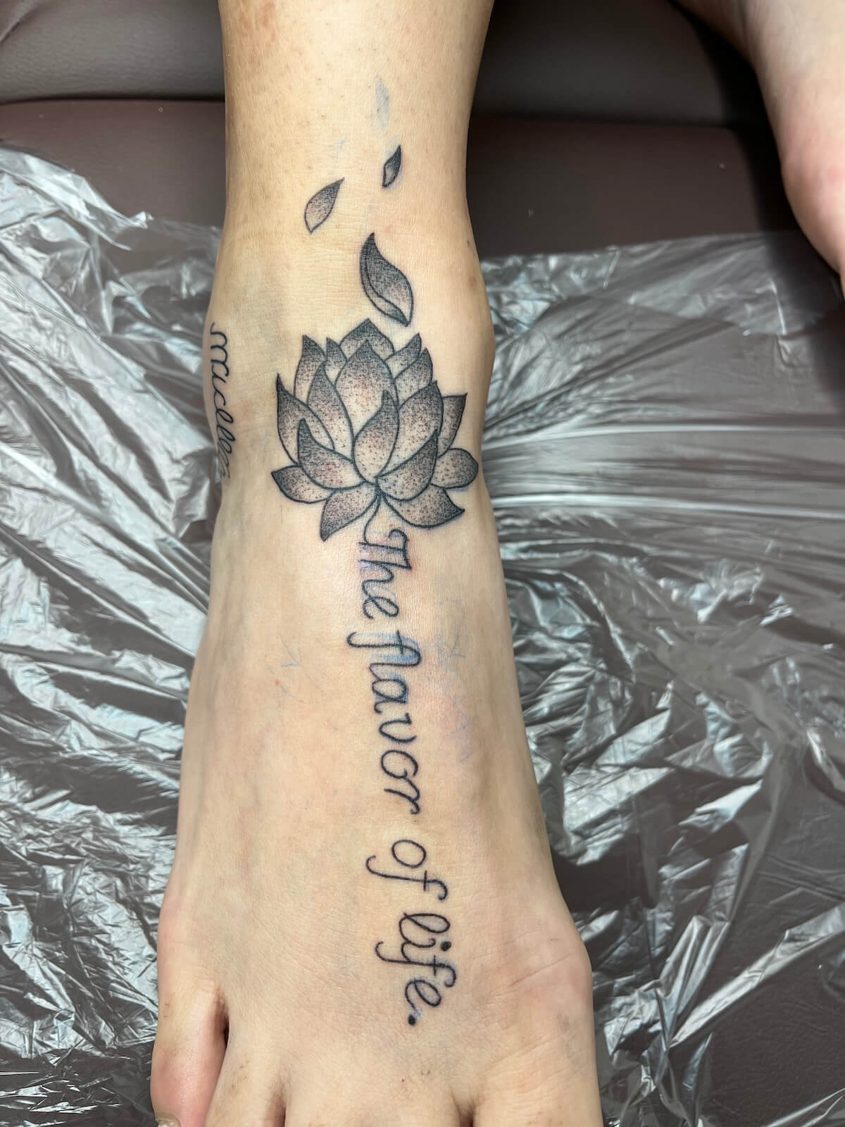足の甲に入れた花とレタリングを組み合わせたタトゥーです。